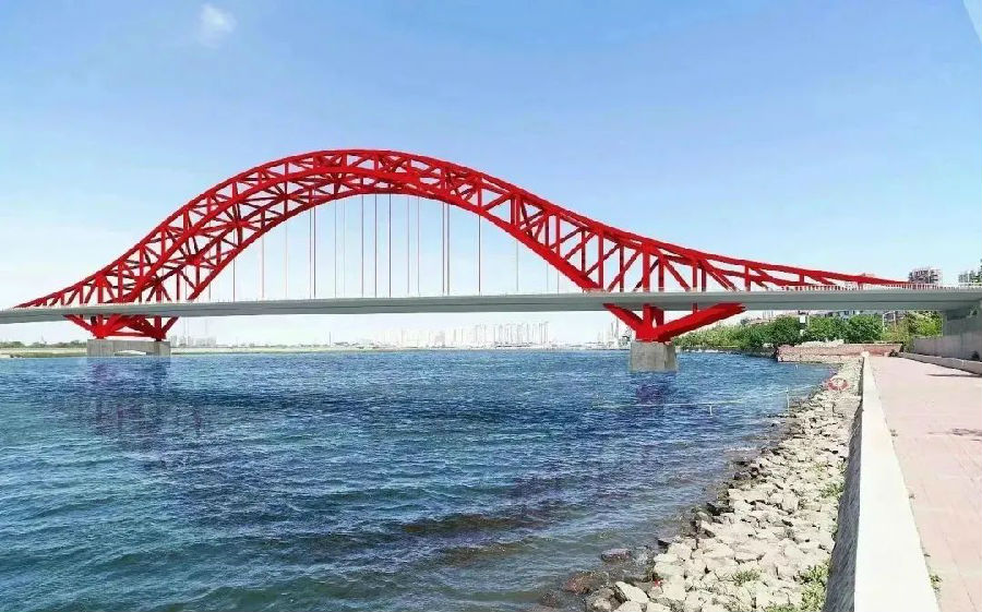 該項目位于天津市濱海新區,南起海河南岸曙光道,北與車站北路跨鐵路橋順接,設置跨海河特大橋、南岸引橋和上海道互通立交各一座,主橋為一座72米+216米+72米三跨連續中承式鋼桁架系桿拱橋,主拱矢高48米,路線總長度約2.1千米,主線設計速度50公里/小時,為雙向6車道城市主干路。合同額12.02億元,工程預計于2025年12月31日竣工。